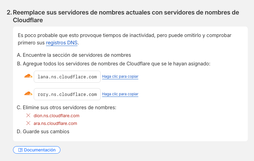 Cuando cambias los nameservers de tu dominio para que apunten a Cloudflare, estás indicando a Internet que Cloudflare será quien gestione las consultas y registros DNS de tu dominio.
