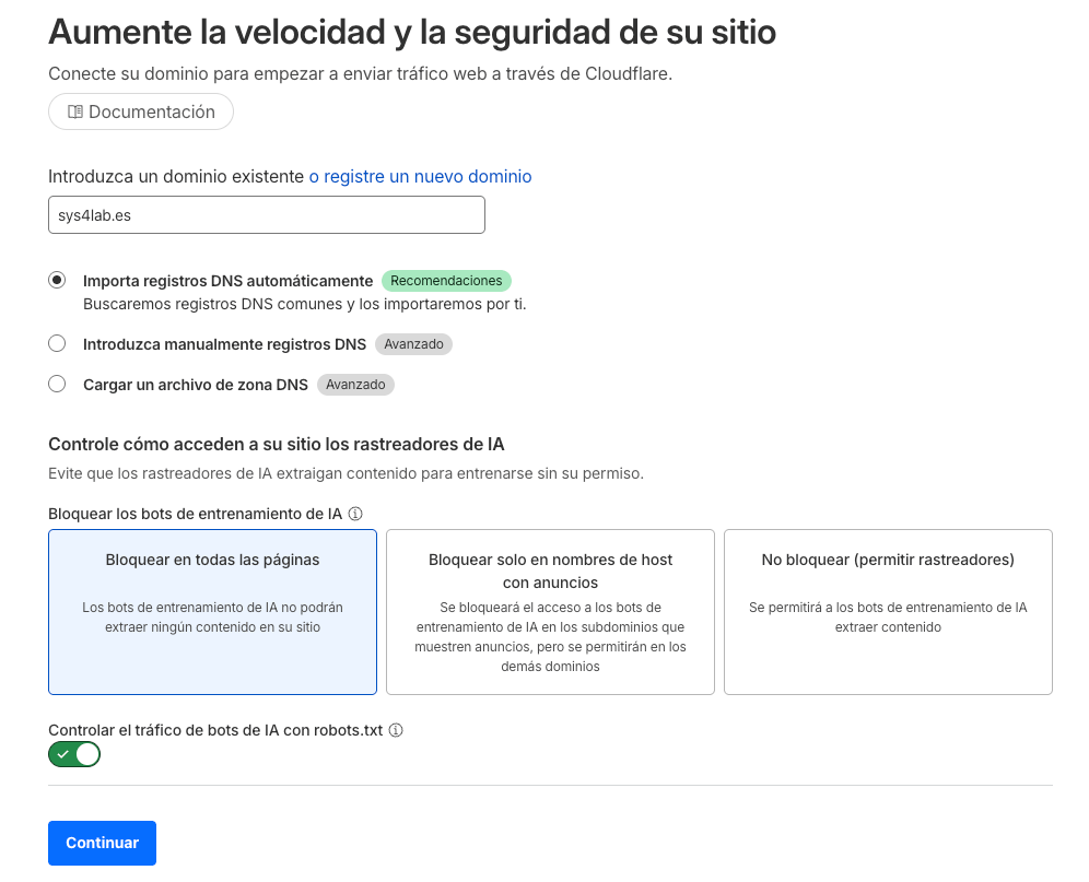 Desde dentro del panel de gestión de Cloudflare, verás un botón que dice "Incorporar dominio", al hacer click te saldrá un formulario para que introduzcas el nombre de dominio y unas configuraciones selectas: