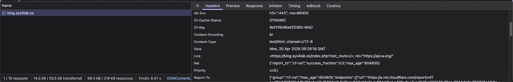 Para comprobar que la web está utilizando Cloudflare, puedes activar las herramientas de desarrollo del navegador pulsando F12 y en la pestaña Network, comprobar en la petición a la web que algunas cabeceras empiecen por "Cf-", esto indicará que Cloudflare está sirviendo la web: